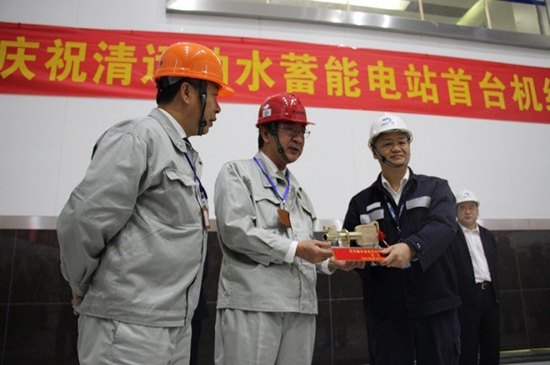 在11月30日上午舉行的清遠抽水蓄能電站首臺機組投產(chǎn)發(fā)電儀式上,東芝水電總經(jīng)理戶(hù)田一典先生將象征高品質(zhì)、高性能、高可靠性產(chǎn)品的“金鑰匙”交到了清遠蓄能發(fā)電公司領(lǐng)導手中。此次清遠抽水蓄能電站首臺機組的成功投產(chǎn),是東芝水電發(fā)展歷史上的里程碑,標志著(zhù)東芝水電具備大型抽水蓄能機組主機及其附屬設備的設計、制造和電站完整BOP系統的設計成套能力。同時(shí),形成了對抽水蓄能電站主體機電設備進(jìn)行方案制定、采購、安裝、調試、試驗等綜合管理能力,抽水蓄能機組的設計、制造技術(shù)達到了新的高度。